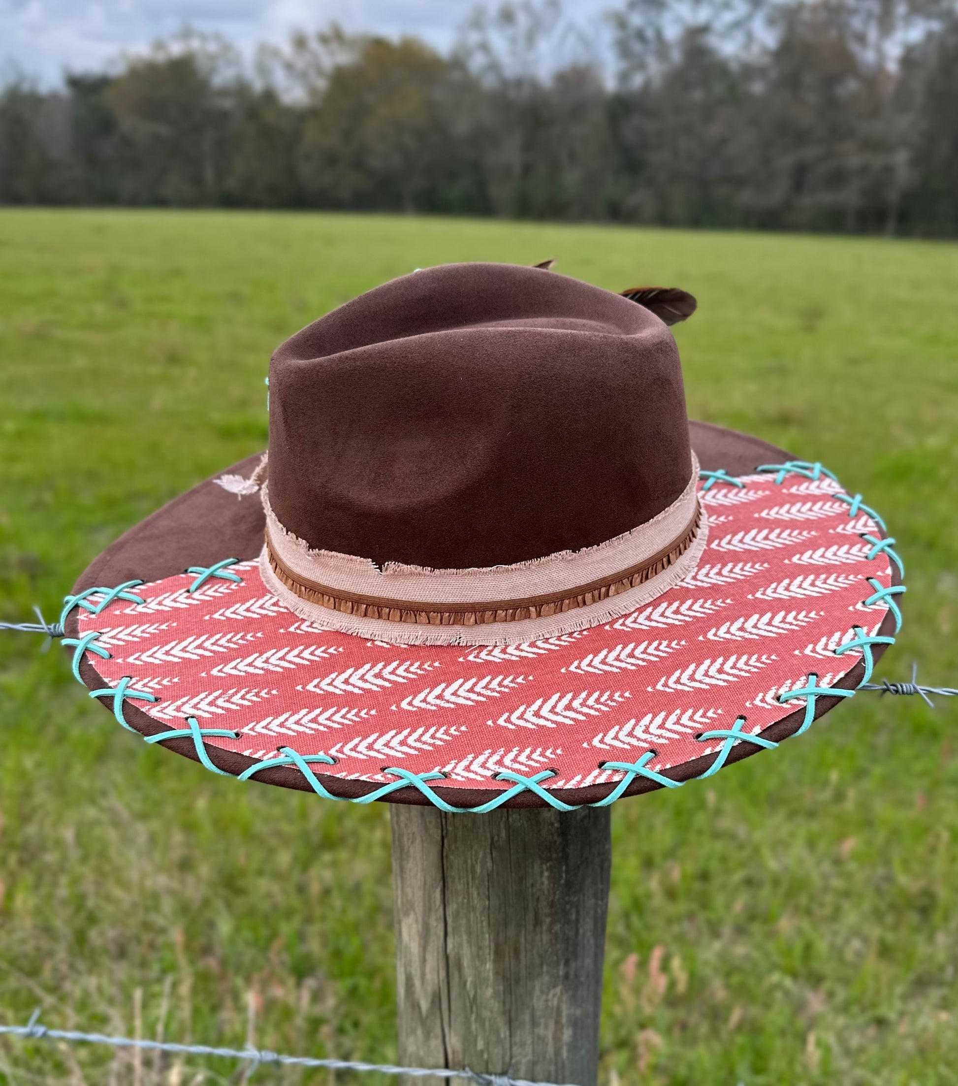 Beautiful Chocolate Large Brim Suede Hat with Boho Feather Canvas Fabric on Brim
