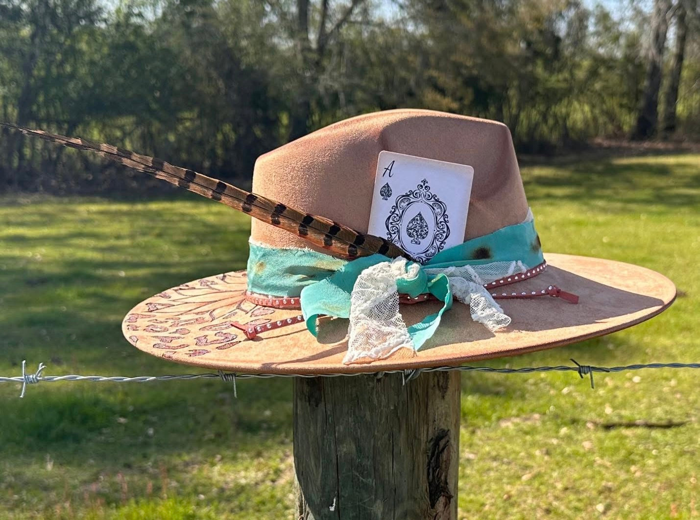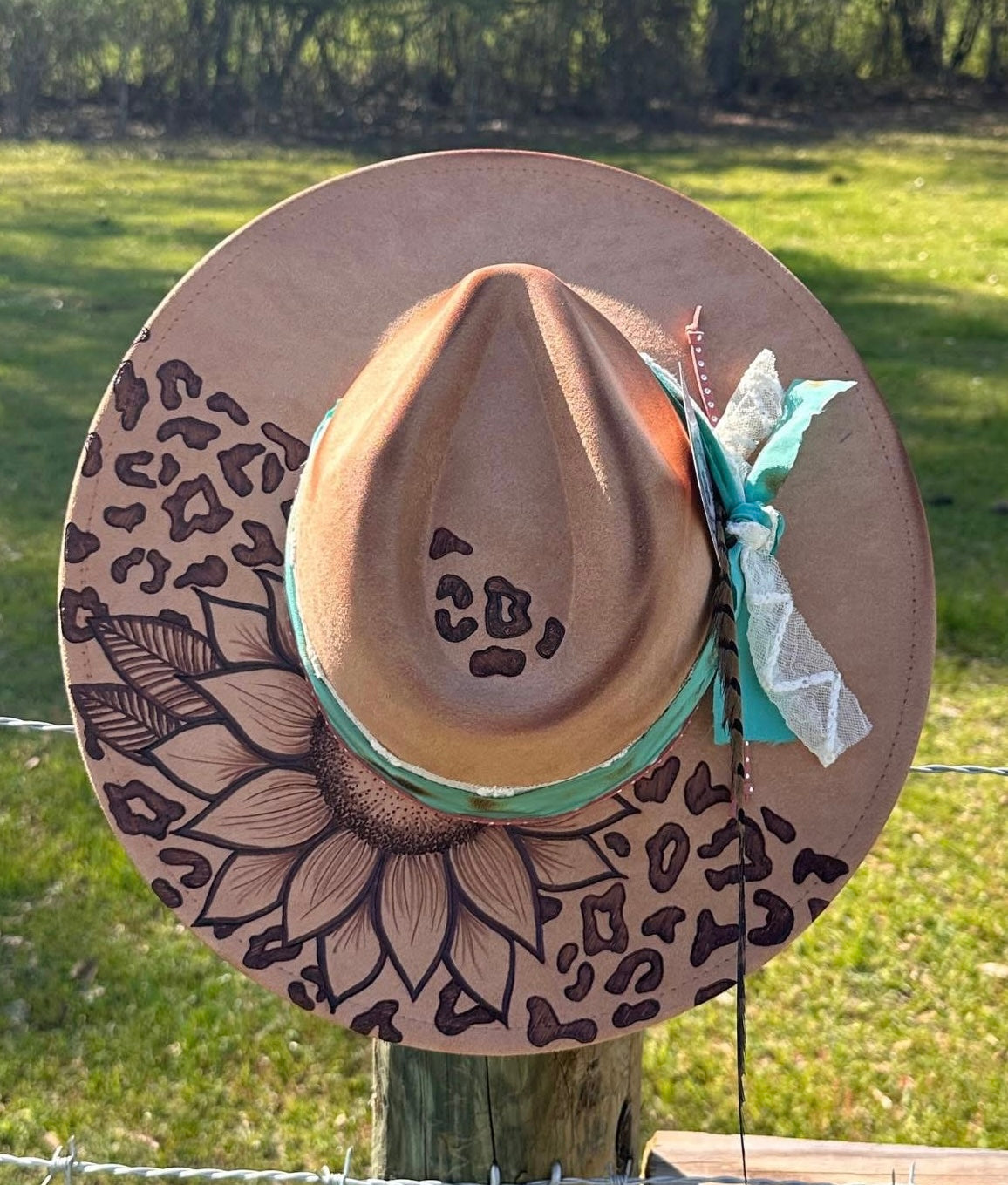 Hand sketched and burnt sunflower and cheetah print large brim suede hat finished with a beautiful playing card, silky blue band and fabulous pheasant feather.